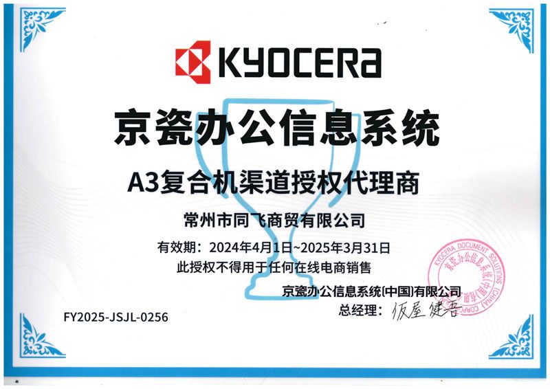 京瓷A3代理證書(shū)